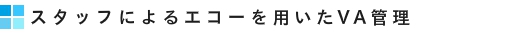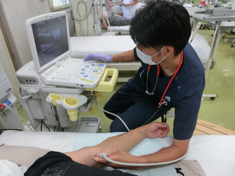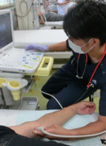 当院では、看護師と臨床工学技士でVAエコーチームを結成し、全ての患者様を対象に通常1年に1回、VAの状態を把握するためにエコーを施行しています。その結果にて、定期的なフォローが必要と判断された場合や、穿刺トラブル、脱血不良、静脈圧上昇、シャント音の異常等があった場合に必要に応じ、エコーを施行し原因を追究し閉塞等の様々なトラブルをできるだけ未然に防げるよう対応しています。