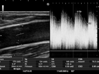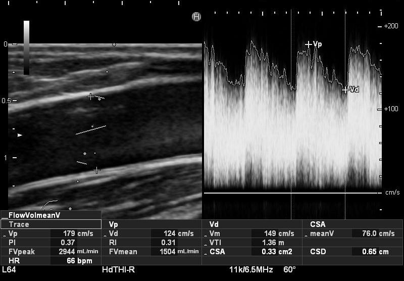 人工血管内シャントにおいては、基本的には自己血管内シャントと同様に上腕動脈血流量での評価をおこないますが、グラフト内での血流測定が可能な場合は測定し参考にしています。※人口血管の種類によってはエコーを通さず測定できない