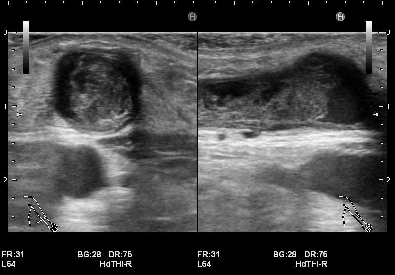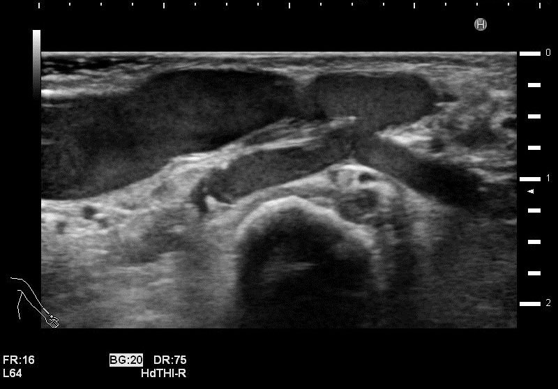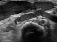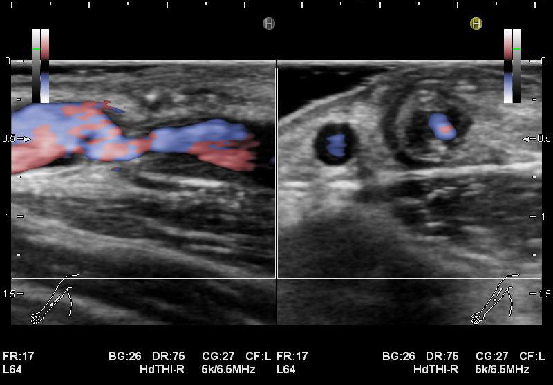 吻合部から中枢へ向かって走査し、血管の走行や太さ、血管までの深さ、狭窄や石灰化、血栓等の有無を観察しています。長軸断面、短軸断面それぞれで観察し、また、カラードプラも使用しできるだけ正確に、血管内の状況を把握するようにしています。