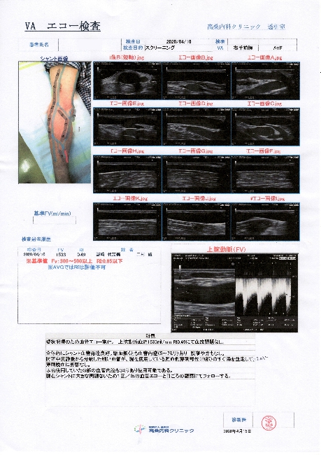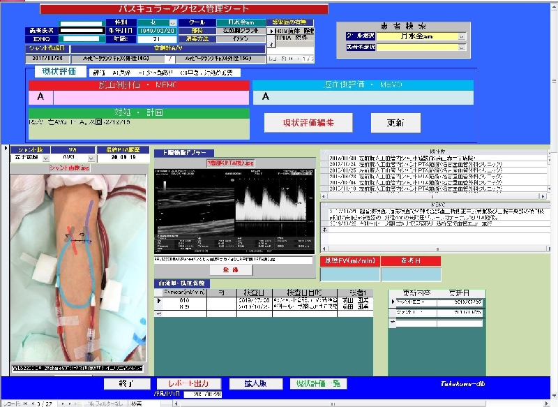 これらのエコー結果は直ちにTakakuwaデータベースシステム内でVAカルテが作成され、Drが読影して機能・形態評価を総合的に判断します。またトラブル時には原因を追究し、それに応じて穿刺部位の選定や、PTA等の対応が必要と判断された場合は血管外科の対応をとっています。