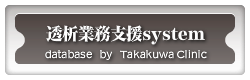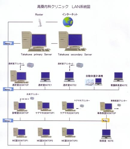 高桑内科クリニック臨床工学科では、平成10年院内LANを構築したことに併せて、分散型コンピュータシステムの一つで、アプリケーションソフト、データベースなどの情報資源を集中管理する「サーバ」と、そのサーバの管理する資源を利用するコンピュータである「クライアント」が接続されたコンピュータネットワーク、いわゆる「クライアントサーバシステム」を確立しました。そして患者情報や検査、投薬、透析条件などの記録をデータベース化して管理を行う当院独自の透析業務支援システムを開発しました。市販のソフトを用いて自作することで、施設の需要に応じたシステム(無駄のない)を作ることができるほか、メーカー等の支援システムに比べ、コストパフォーマンス的にも大変優れています。近年、当院のようなサテライト透析施設においても患者さんは高齢化、重症化しております。したがってデータの一元管理は、写しなどの手書き作業の単純なルチン業務を減らすことができ、ヒューマンエラーを無くせるばかりか、空き時間を様々な患者ケアにまわすということが可能となります。