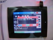 1、体重計横に設置した液晶タッチパネル上に表示した、自分の名前をタッチします。(透析スケジュール機能により管理されている本日治療を行う透析患者名が、パネル上に作られた透析室見取り図のベッド位置に表示されています)