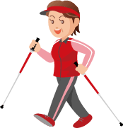 ウオーキングの基本は30分以上止まらないこと。10分に1分間早足を3セット(計30分)行いましょう。また転倒防止のためにも両手にスキーのストックを持って地面を突きながらリズムよく歩く「ノルディックウォーキング」をお勧めします。