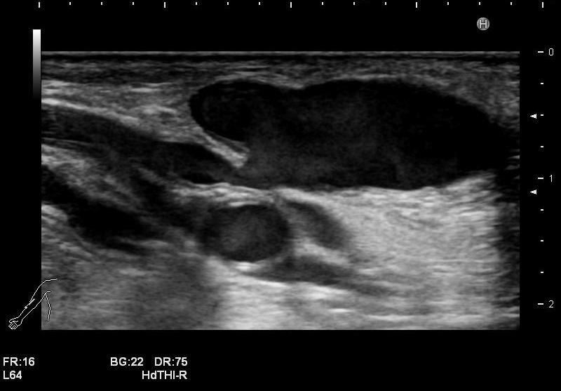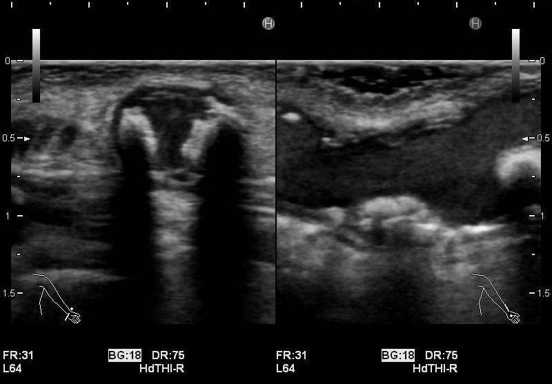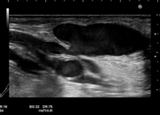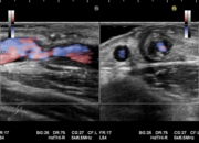 吻合部から中枢へ向かって走査し、血管の走行や太さ、血管までの深さ、狭窄や石灰化、血栓等の有無を観察しています。長軸断面、短軸断面それぞれで観察し、また、カラードプラも使用しできるだけ正確に、血管内の状況を把握するようにしています。