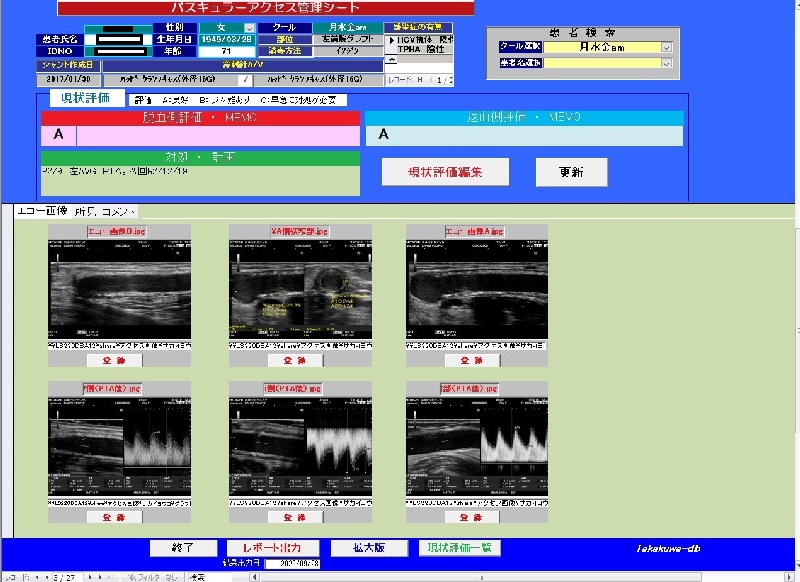 これらのエコー結果は直ちにTakakuwaデータベースシステム内でVAカルテが作成され、Drが読影して機能・形態評価を総合的に判断します。またトラブル時には原因を追究し、それに応じて穿刺部位の選定や、PTA等の対応が必要と判断された場合は血管外科の対応をとっています。